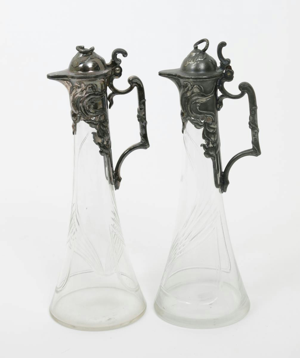 A pair of W.M.F pewter and glass decanters, with hinged covers, the cast with flowers, the glass body with cut foliate design stamped marks, 26cm. high