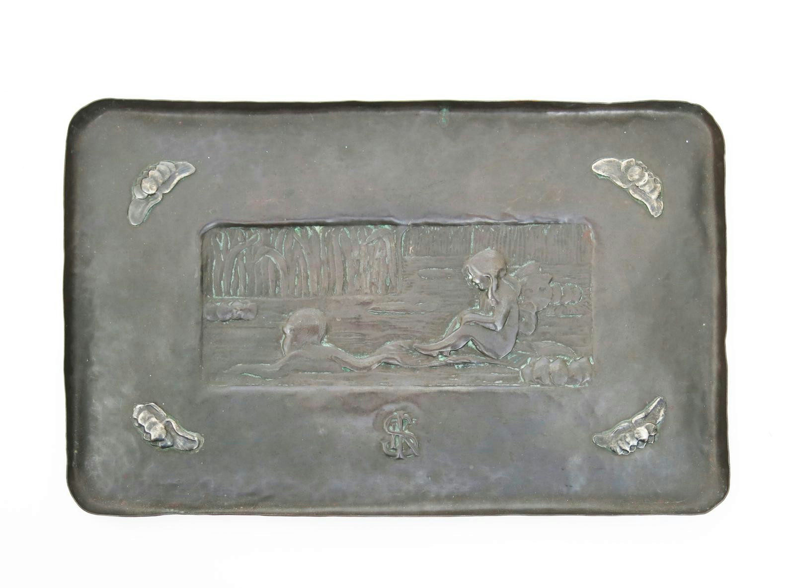 A patinated copper tray, rectangular, the well cast in low relief with a water nymph pulling a fairy across a pond on a lilypad signed in the cast D R Kuck, 29.5cm. wide