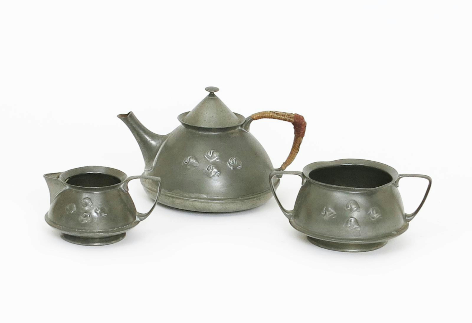 A Liberty & Co Tudric Pewter three piece tea set, model no.0303, cast in low relief with a stylised foliate panel, comprising teapot and cover, milk-jug and sugar basin stamped marks, 12.5cm. high