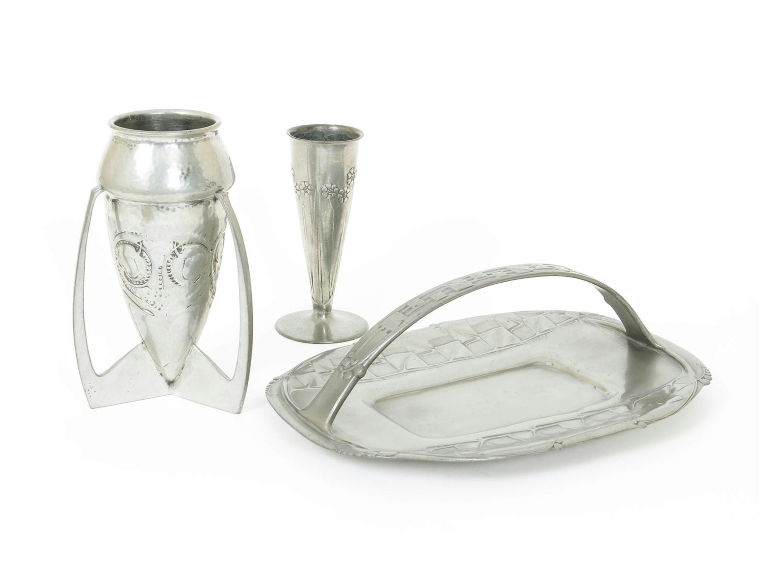 A Liberty & Co Tudric Pewter vase designed by Archibald Knox, bombe form on tripod foot, cast in low relief with Art Nouveau foliate design, another pewter vase model 0821 and a tray designed by Archibald Knox, stamped marks 19cm. high (3)
