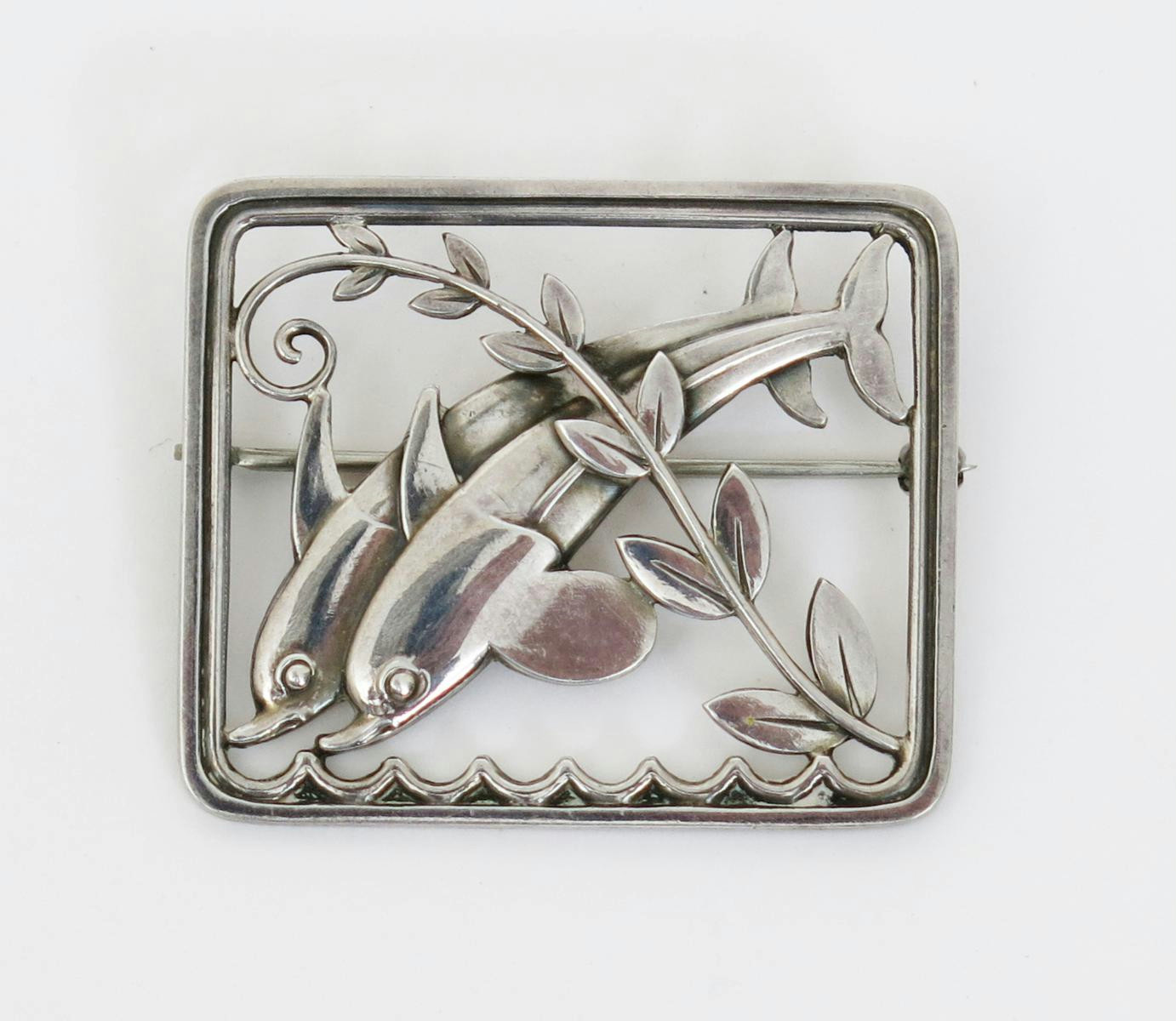 A Georg Jensen silver brooch, model no.251, pierced rectangular form cast with twin leaping dolphins stamped marks, 4cm. wide