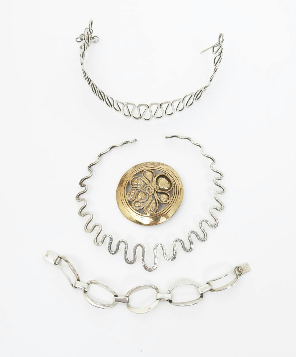 A silver link bracelet, by T E From, two silver neck rings and a collection of jewellery stamped marks, 16.5cm. wide