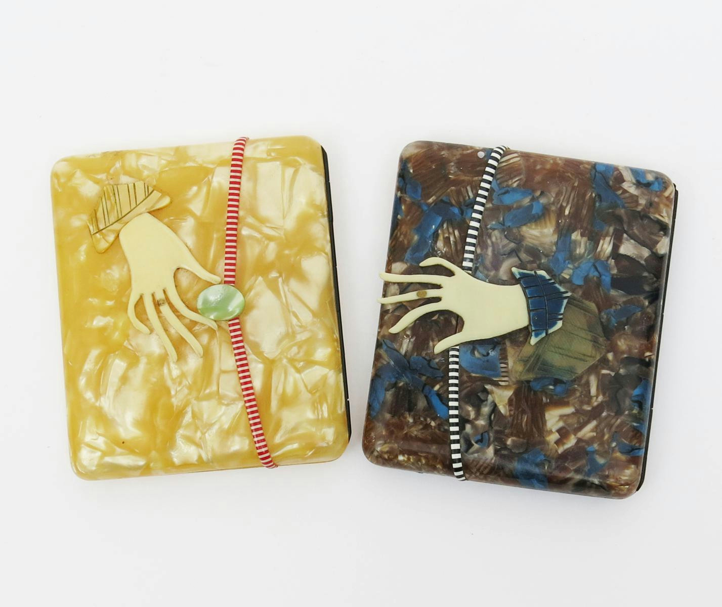 Two French hand-clasp celluloid cigarette cases, one marbled cream, with yellow sleeved ivorine hand holding a green pebble forming the clasp, the other in a deep chocolate and blue marble, the blue checked sleeve hand curving over the edge as the clasp stamped Foreign,