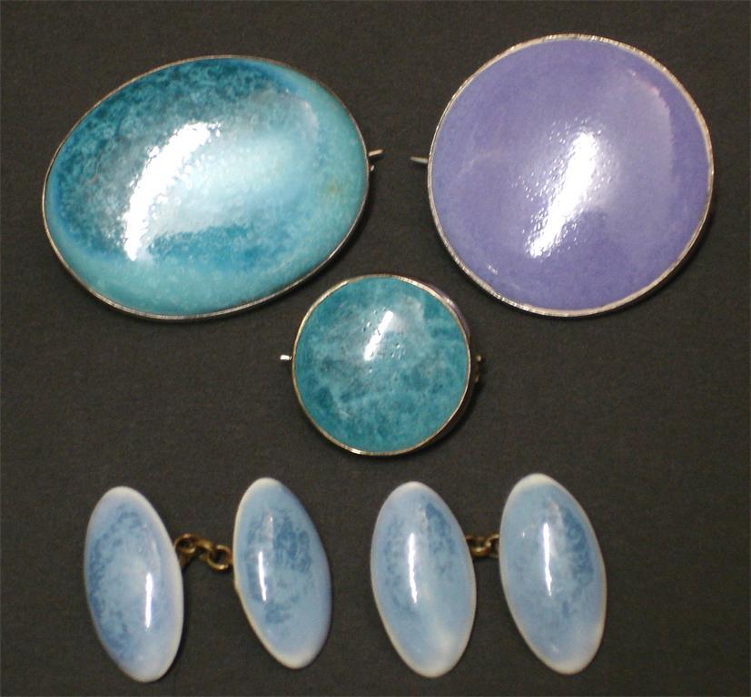 Three Ruskin Pottery stoneware brooches, with metal mounts and pins, two with blue and one purple souffle glazes, and a pair of stoneware cuff links impressed marks, one rim stamped silver rim largest brooch 3.5cm. wide.