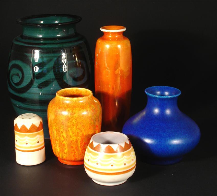 A Ruskin Pottery stoneware vase covered in an orange lustre glaze, two Pilkington's Lancastrian vases, a Cricklade vase and two pieces of Poole Pottery various marks, Ruskin dated 1913