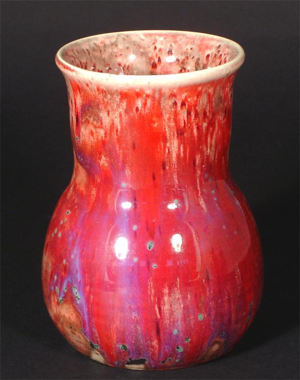 A Ruskin Pottery high-fired stoneware vase ovoid body with collar neck and flaring rim, covered in a sang de boeuf glaze with lavender and mint spots impressed marks 15cm. high