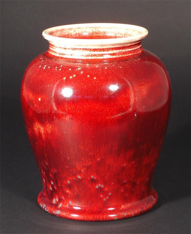 A Ruskin Pottery high-fired stoneware vase shouldered form, covered in a deep sang de boeuf glaze impressed marks date mark 1910, hairline to top rim 18cm. high