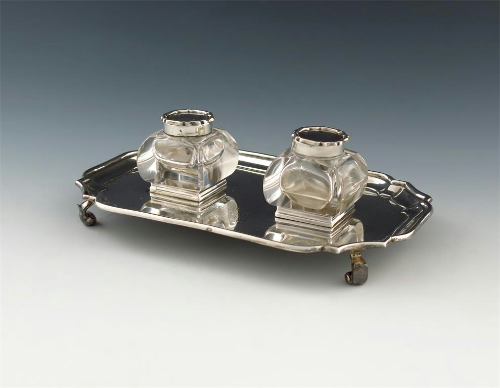 shaped rectangular form, moulded border, inscribed 'Major V. Halford, on his marriage 4th June 1908 from his Officers, 2nd York and Lancaster Regiment', on four scroll feet, with two silver-mounted cut-glass inkwells, length 21cm, approx. weight 10oz.