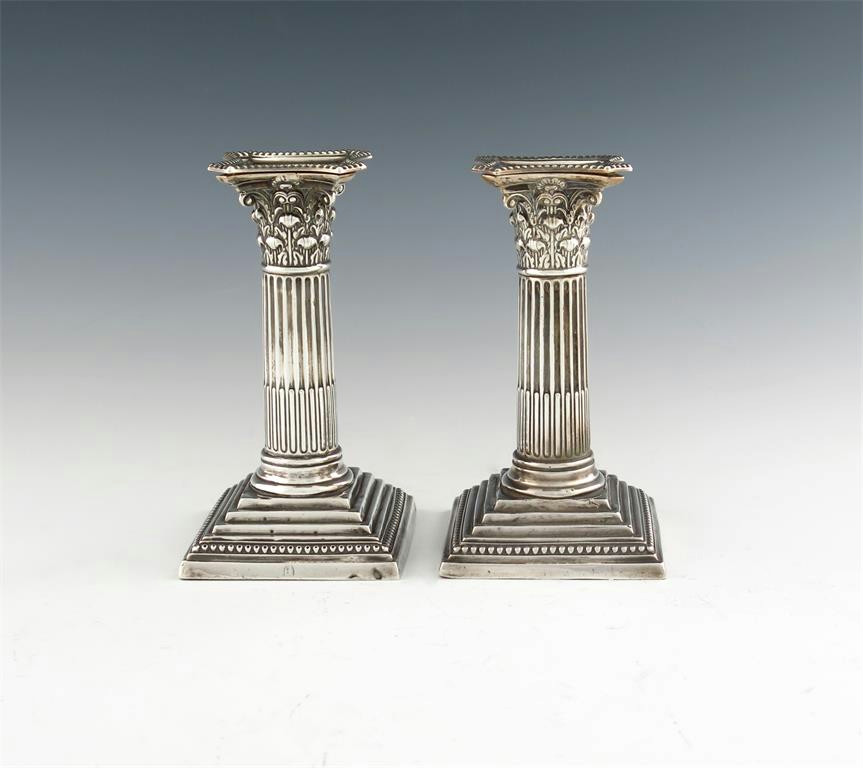 Corinthian column form, with beaded borders, on stepped square bases, height 14.8cm. (2)