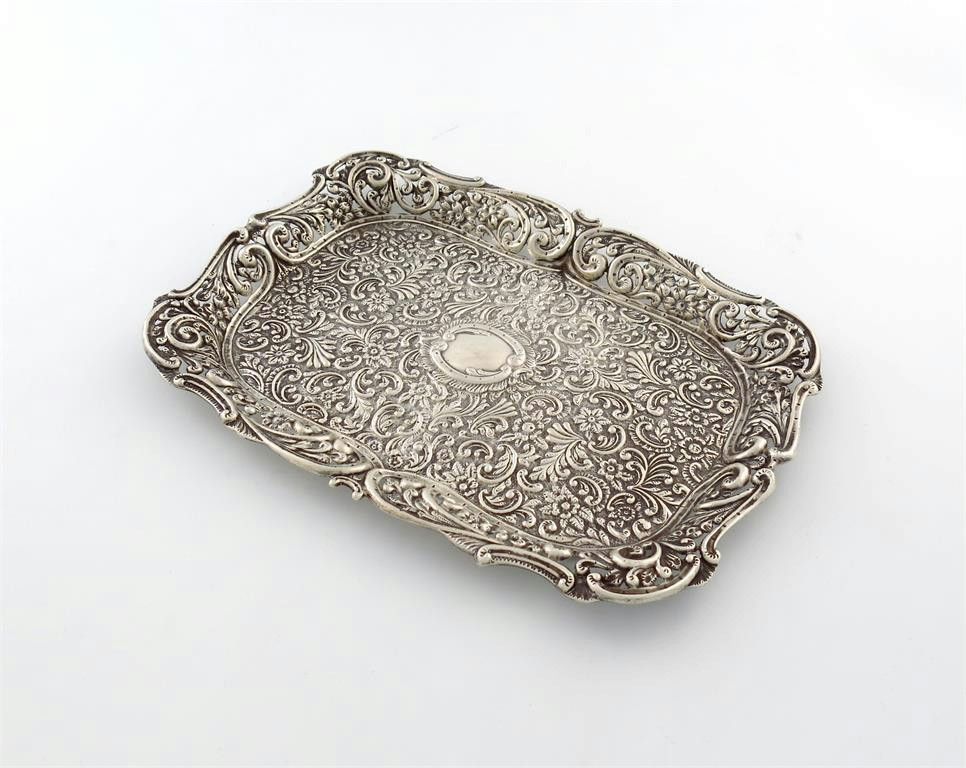 rectangular form, embossed foliate scroll decoration on a matted background, pierced foliate scroll border, length 30.5cm, approx. weight 11oz.