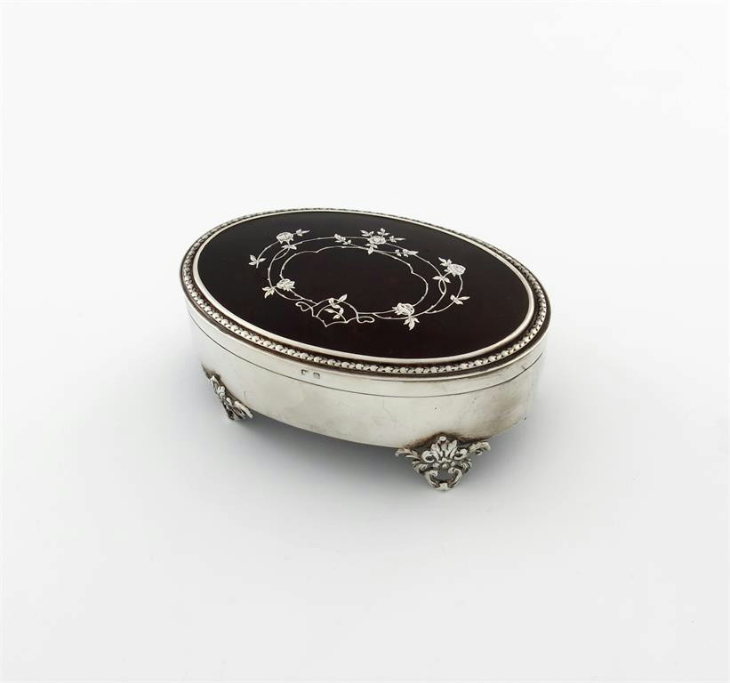 oval form, the hinged cover inlaid with foliate pique decoration, swag border, on four pierced bracket feet, length 13cm.