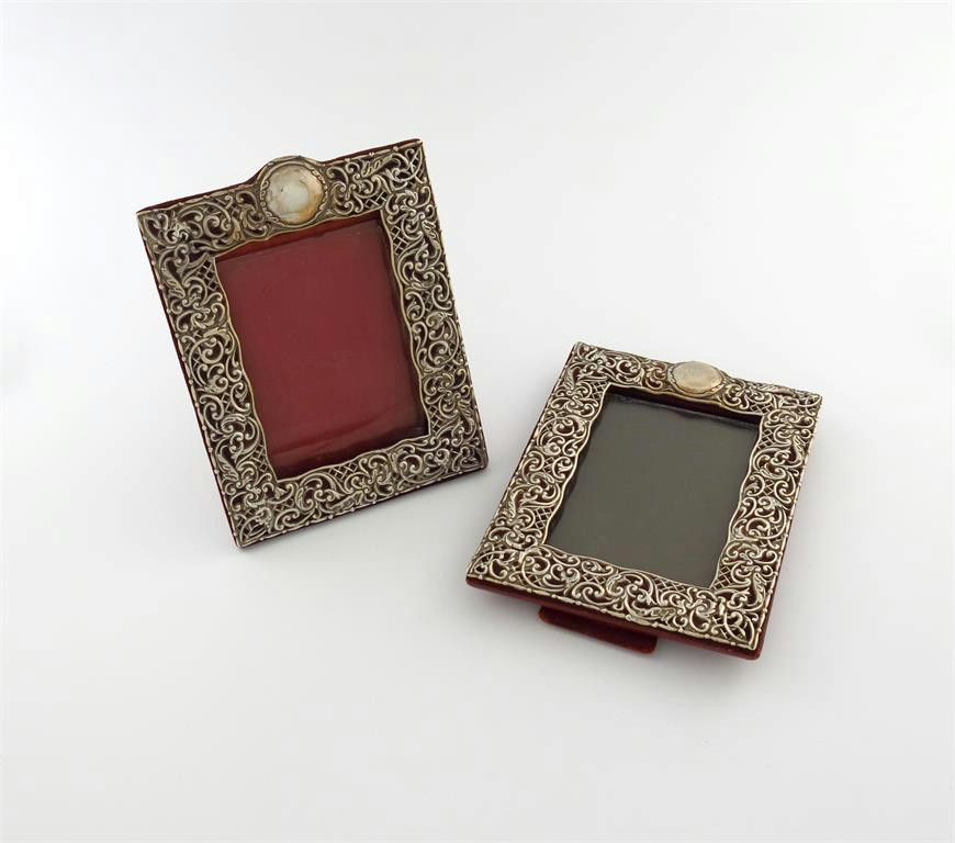 with pierced foliate, scroll and lattice decoration, vacant circular cartouche, red leather easel back, one with silk lining, height 21.5cm. (2)