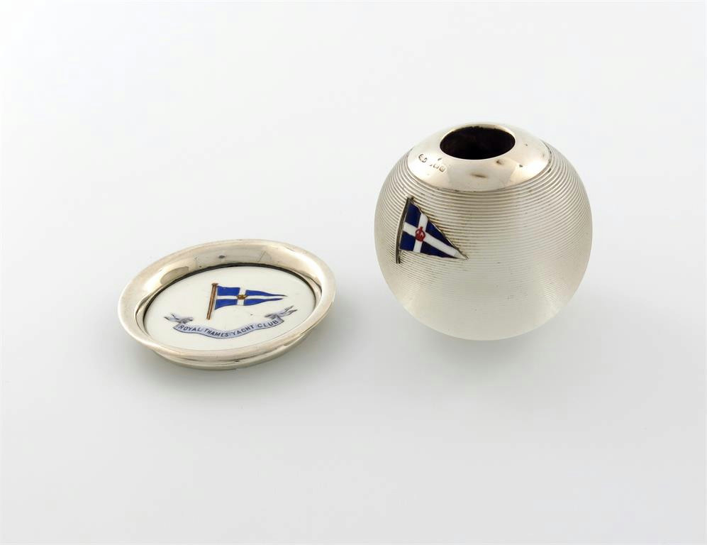 plain mount, the front applied with the enamel burgee of The Royal Thames Yacht Club, height 6cm, plus an unmarked silver-mounted ceramic pin dish, by Aynsley, the centre with the burgee of Royal Thames Yacht Club, diameter 7.2cm. (2)