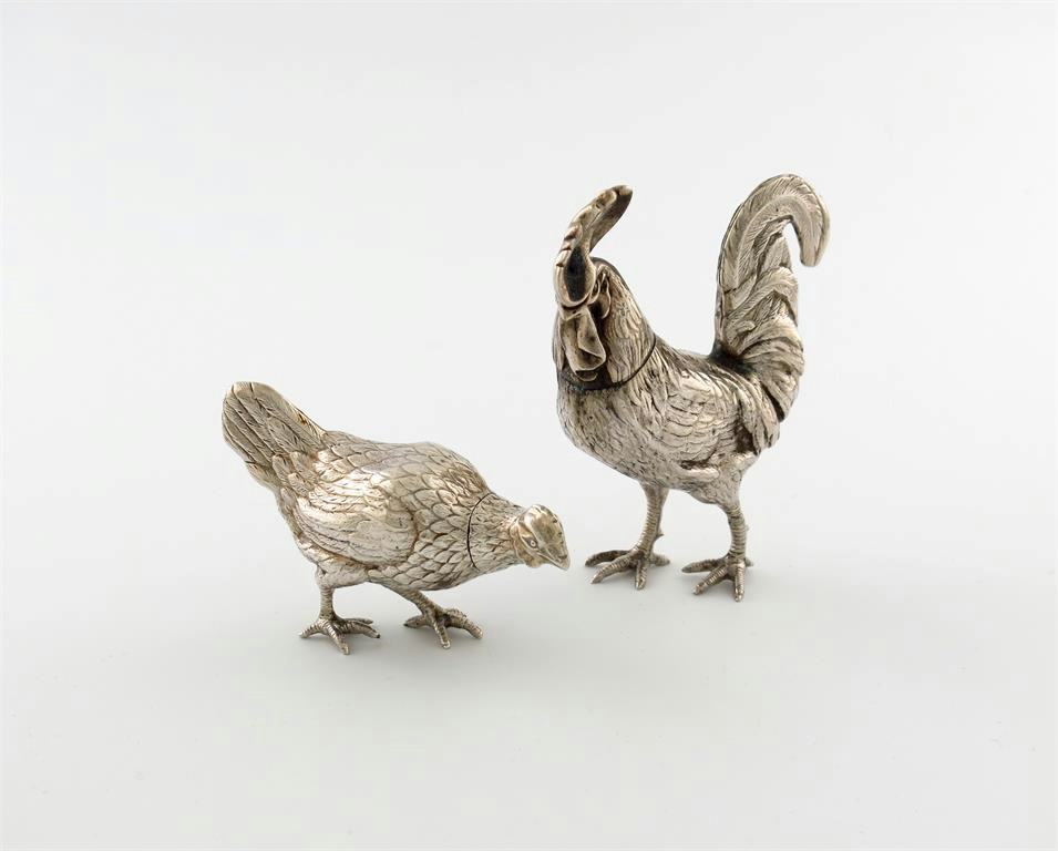 modelled as a standing cock and hen, pull-off pierced heads, height of cock 10cm, approx. weight 7oz. (2)