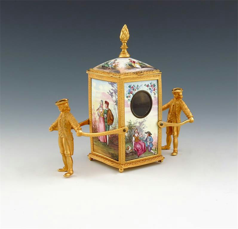 the sedan chain of rectangular form, decorated with figures in landscape settings, domed cover with a cone finial, the sides with two circular windows, carried by two gilt metal footmen, height 12.5cm,