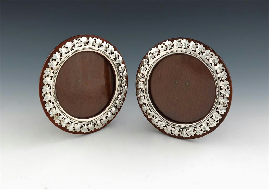 circular form, pierced and engraved leaf border, with an inner beaded border, replacement wooden easel backs, diameter 15.2cm. (2)