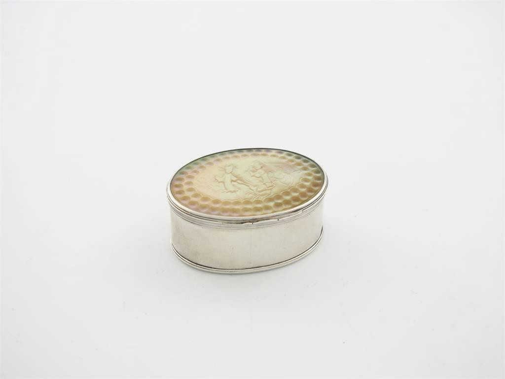 oval form, the hinged cover carved with two Chinoiserie figures, plain silver sides and base, length 6.5cm.