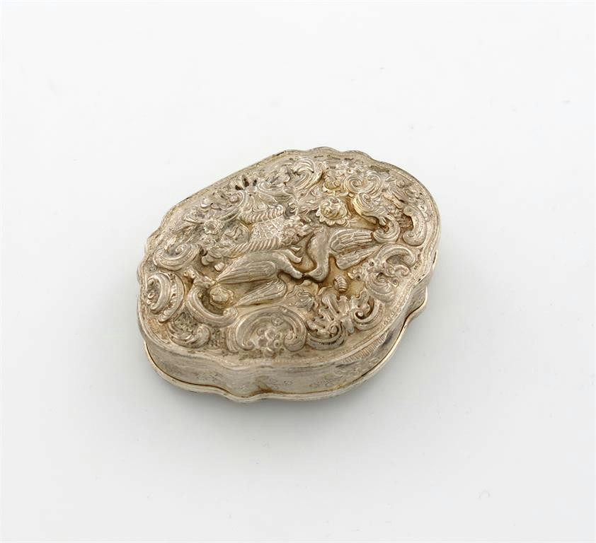 shaped cartouche form, embossed with birds and foliate scroll decoration, the underside of the base with a town scene, length 8.5cm