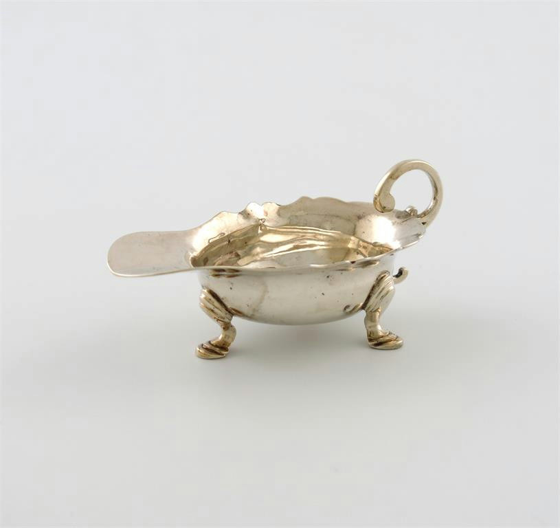 oval form, scroll handle, wavy-edge border, on three scroll legs, length 8.3cm, approx. weight 0.8oz.