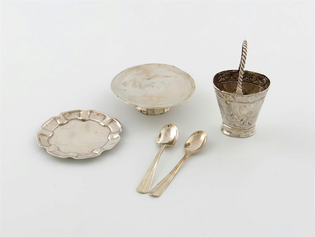 comprising: a footed salver, the underside scratch initialled 'S.L' over 'M.L', '1746', diameter 6.5cm, a shaped circular salver, the underside scratch initialled 'S.L' over 'F.L', diameter 5.7cm, two Hanoverian pattern spoons, plus a nineteenth century continental basket, of tapering oval form, embossed with flowers, approx. total weight 1.4oz. (5)