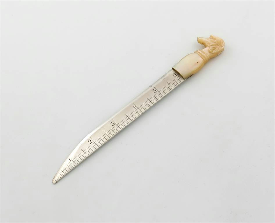 the blade with a six inch ruler, the mother-of-pearl handle carved with a dog's head, length 20.8cm.