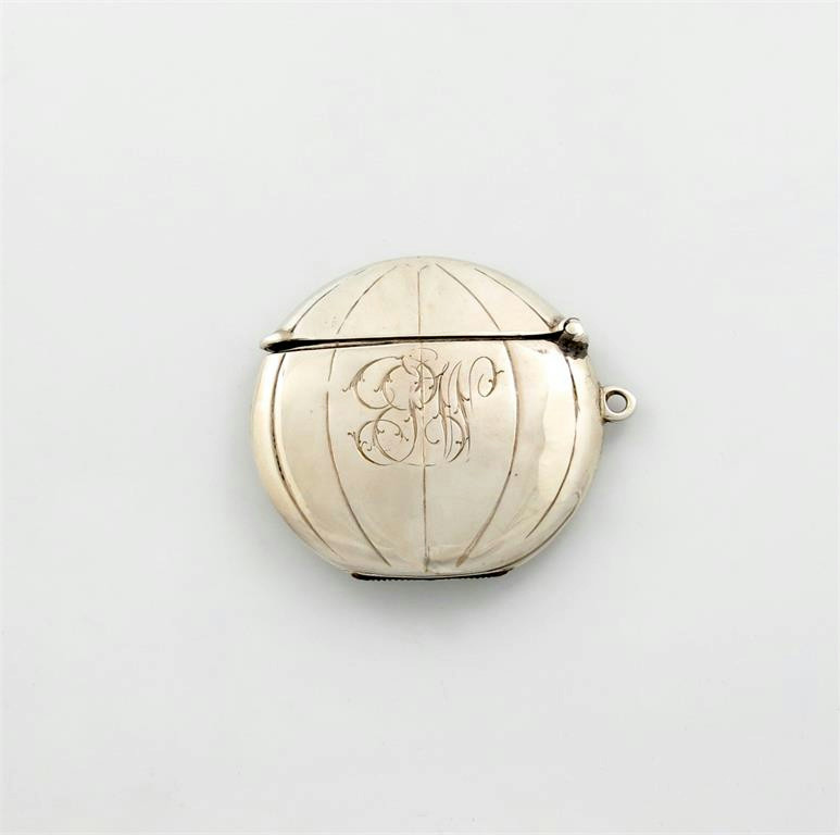 modelled as a football, hinged cover, with a ring attachment, engraved with a monogram, length 4.9cm, approx. weight 0.5oz.