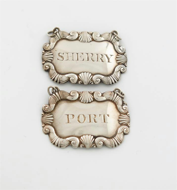 shaped oblong form, shell and fluted scroll border, incised 'SHERRY' and 'PORT', length 4.8cm, approx. weight 0.7oz. (2)