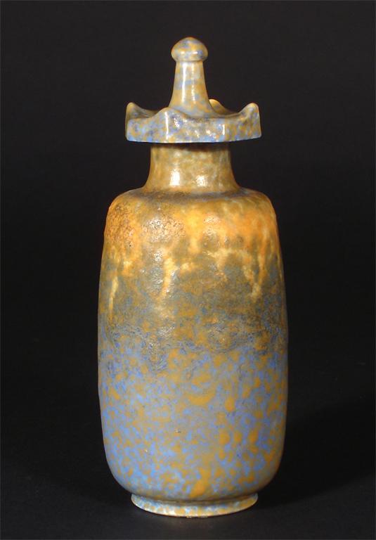 A Ruskin Pottery stoneware Pagoda Topped perfume bottle and stopper covered in a mottled orange...