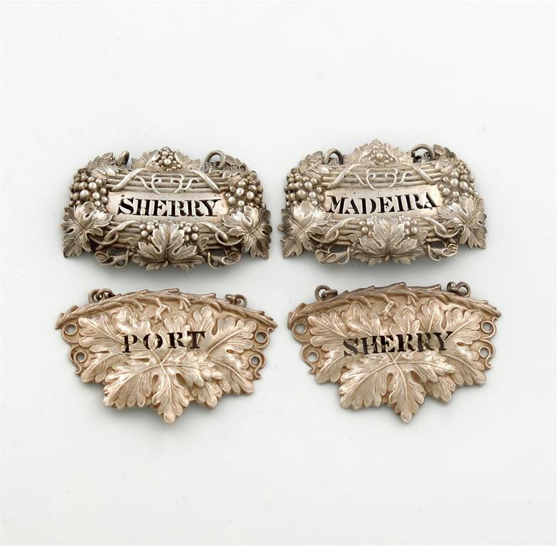 shaped form, embossed with bunches of grapes and ribbon-tied decoration, pierced 'SHERRY' and 'MADEIRA', length 6cm, plus two Victorian vine leaf border, pierced 'SHERRY' and 'PORT', approx. weight 2.3oz. (4)
