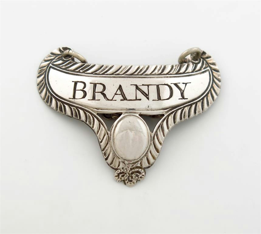 scroll form, feather-edge border, with an oval vacant cartouche, incised 'BRANDY', length 5.1cm, approx. weight 0.3oz.