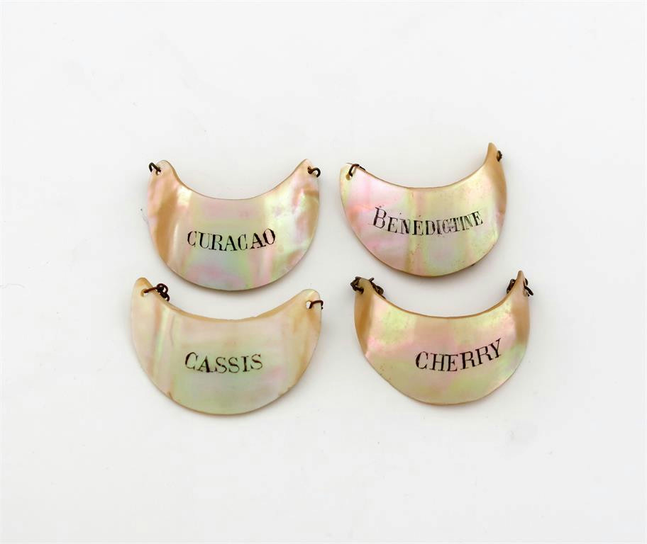 crescent form, titled 'CHERRY', 'BENEDICTINE', 'CASSIS' and 'CURACAO', length 4.8cm. (4)