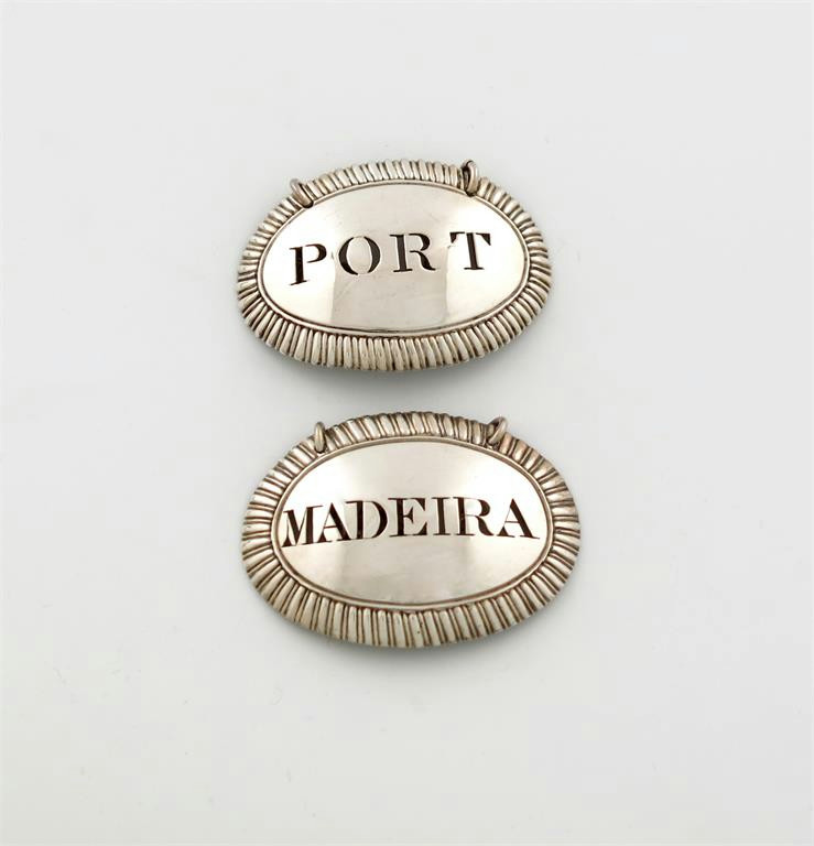 oval form, gadroon border, incised 'PORT' and 'MADEIRA', length 5.5cm, approx. weight 1.5oz. (2)