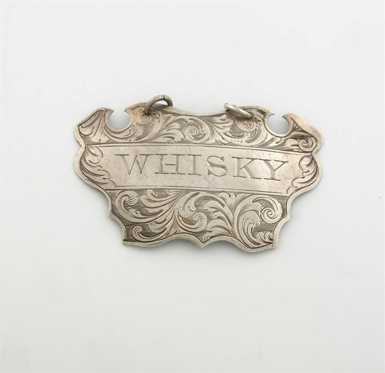 cartouche form, engraved foliate scroll decoration, incised 'WHISKY', length 5.5cm, approx. weight 0.2oz.