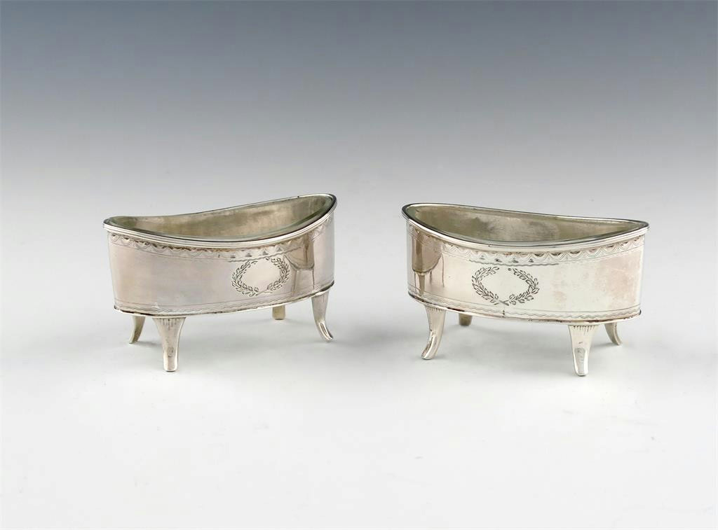 oval navette form, bright-cut decoration, on four bracket feet, with later clear glass liners, length 8.5cm, height 4.8cm, approx. weight 2.7oz. (2)