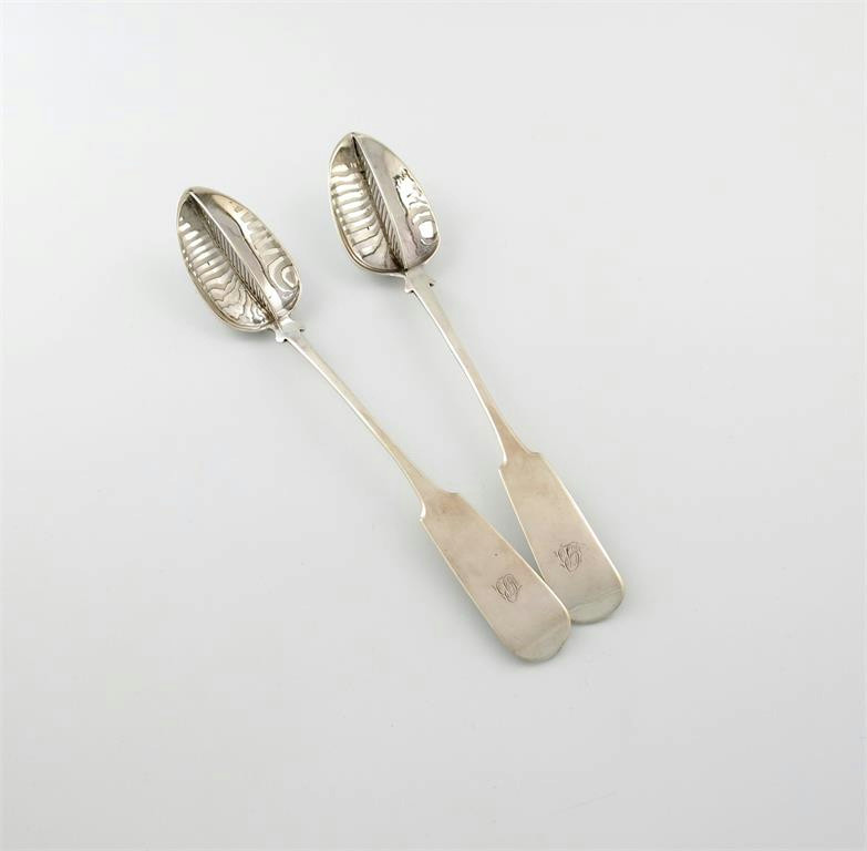 A pair of early 19th century Scottish provincial silver Fiddle pattern straining spoons