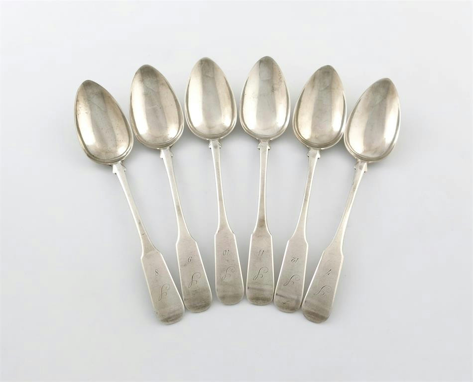 A set of six early 19th century Scottish provincial silver Fiddle pattern tablespoons