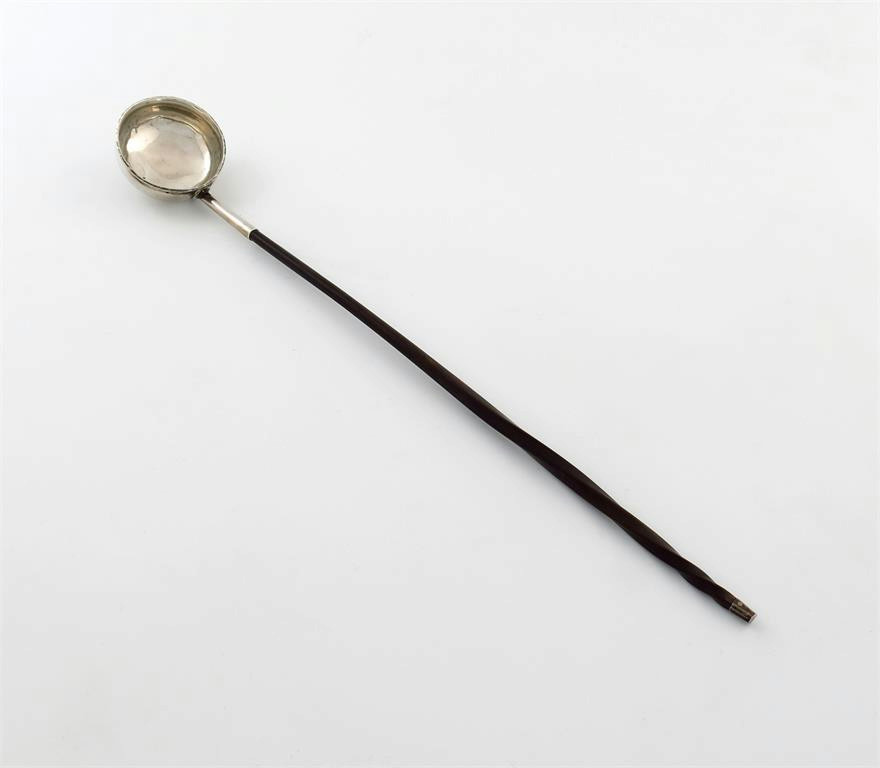 circular bowl, twisted whale-bone handle, the reverse of the bowl with initials, length 39.3cm.