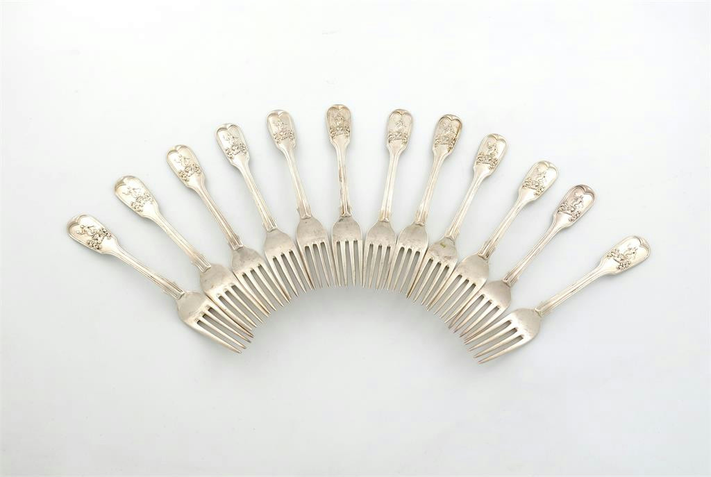 A Victorian Scottish silver set of twelve Private Die Fiddle and Thread pattern table forks