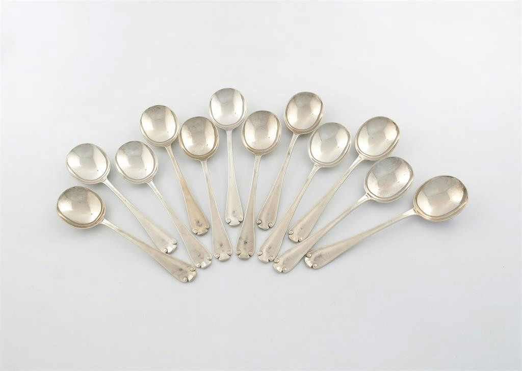 A set of twelve American silver Flemish pattern soup spoons