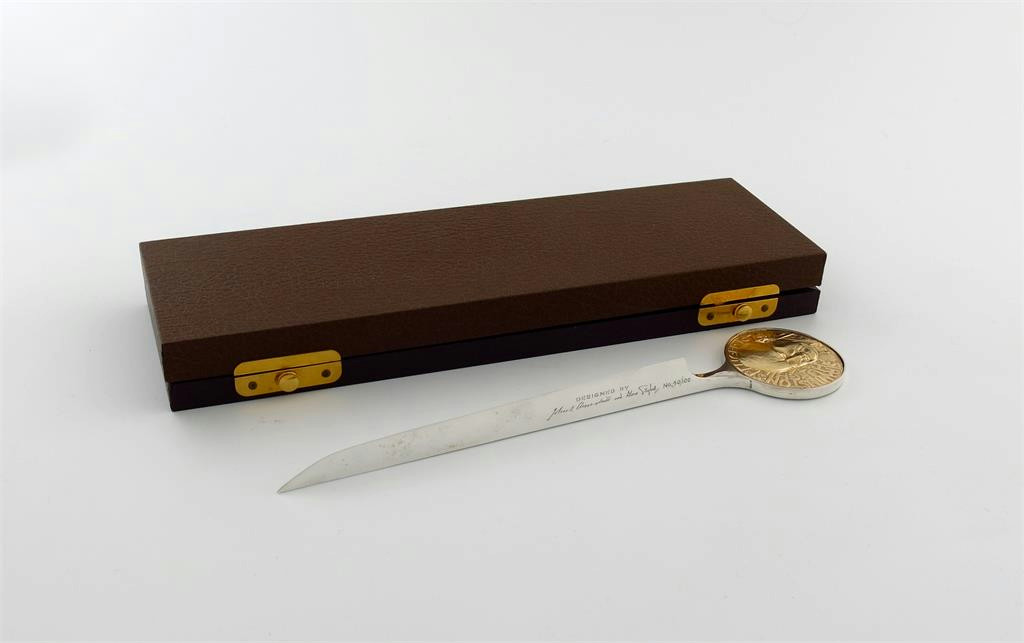 Designed by Alex Styles for Garrard, a commemorative parcel-gilt silver Churchill letter knife,