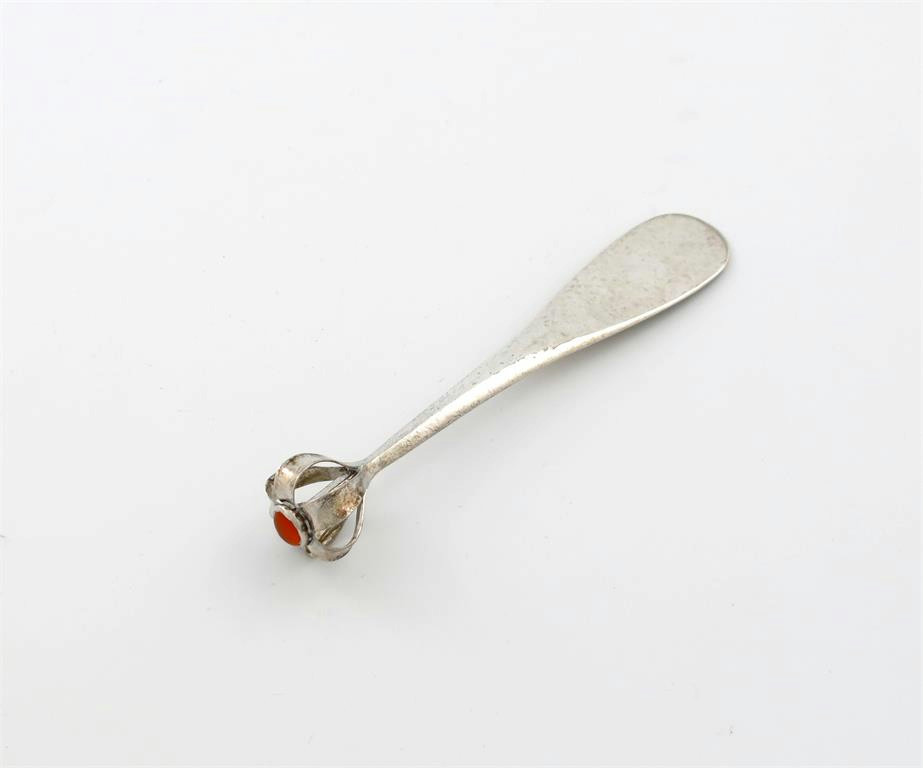 spot-hammered oar shaped body with a pierced scroll wirework finial set with a carnelion