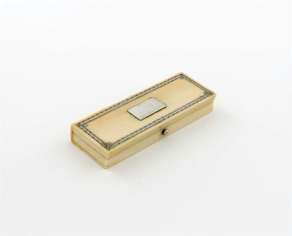 rectangular book form, the spine with carved decoration, the hinged cover inlaid with silver stringing and a central rectangular cartouche, the velvet lined interior with a later mirror, length 8.5cm.