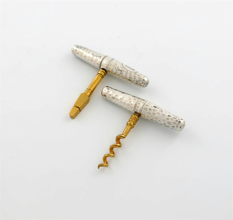 tapering form, spot-hammered decoration, initialled, the key and worn gilded , length closed 9cm and 8.8cm. (2)