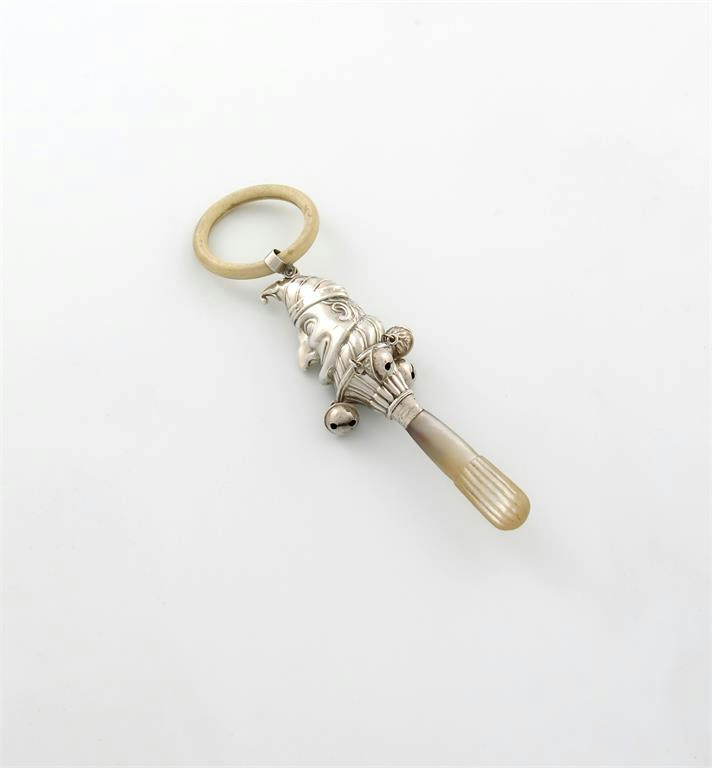 modelled as the head of Mr. Punch, with four bells, a mother-of-pearl handle, and with a plastic teething ring, length 19cm.