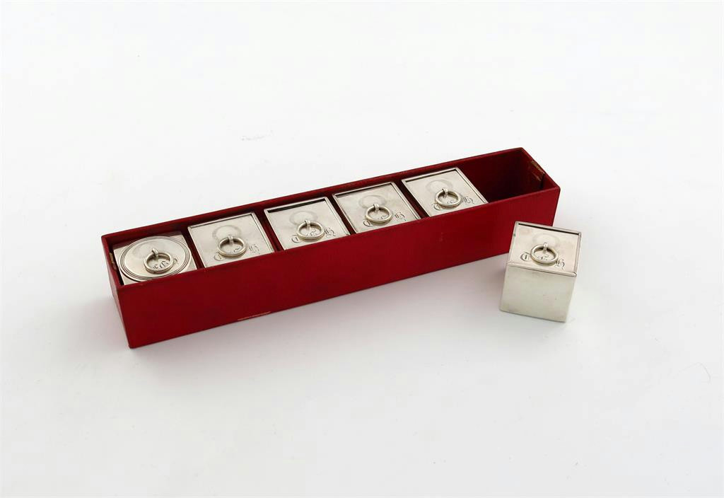 square form, five with slide-off covers with a plain ring finial, one with a pull-off circular cover with a reed border and ring finial, all engraved with initials, in a fitted red Morocco leather-bound tray, height 3.2cm, approx. weight 8.5oz. (6)