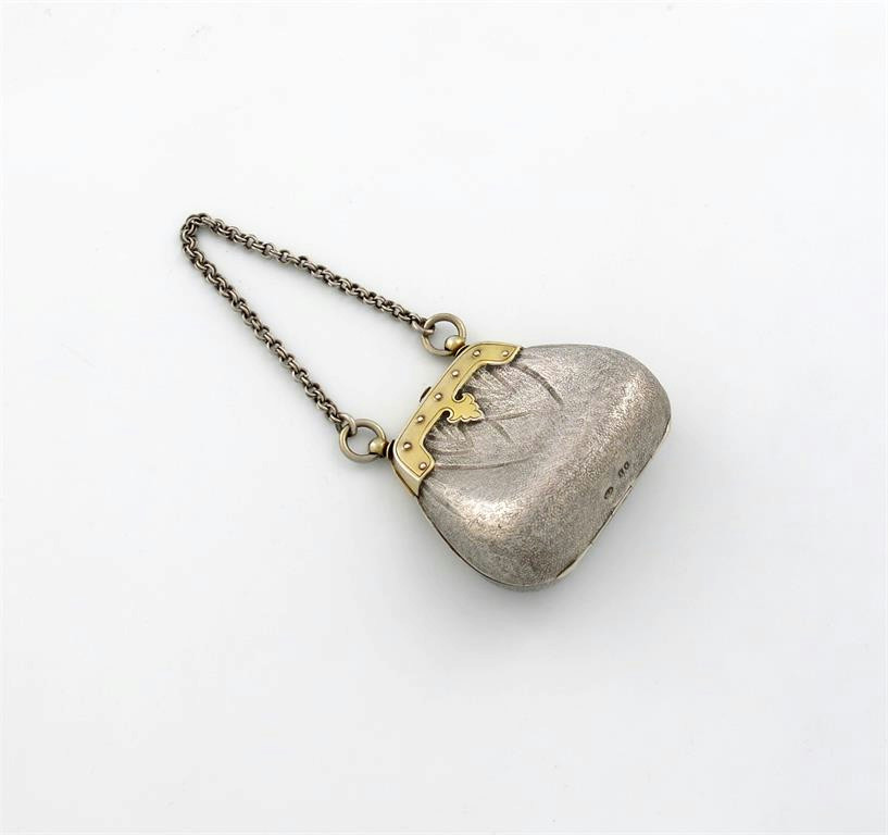 modelled as a handbag, textured simulated material body, with a silver-gilt mount and chain handle, silk lined, length 6.3cm.