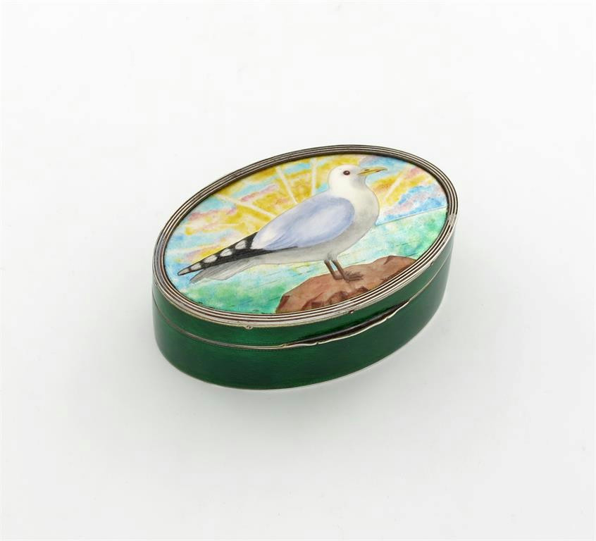 oval form, the hinged cover enamelled with a seagull on a rock, with a seascape behind, green enamelled sides, length 9.3cm.