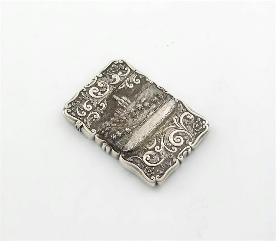 rectangular form, embossed with a scene of Osborne House from the water, chased foliate scroll decoration, the reverse with a foliate scroll cartouche, inscribed 'Elizabeth', in an associated case, case a.f, length 10.1cm, approx. weight 2.5oz.
