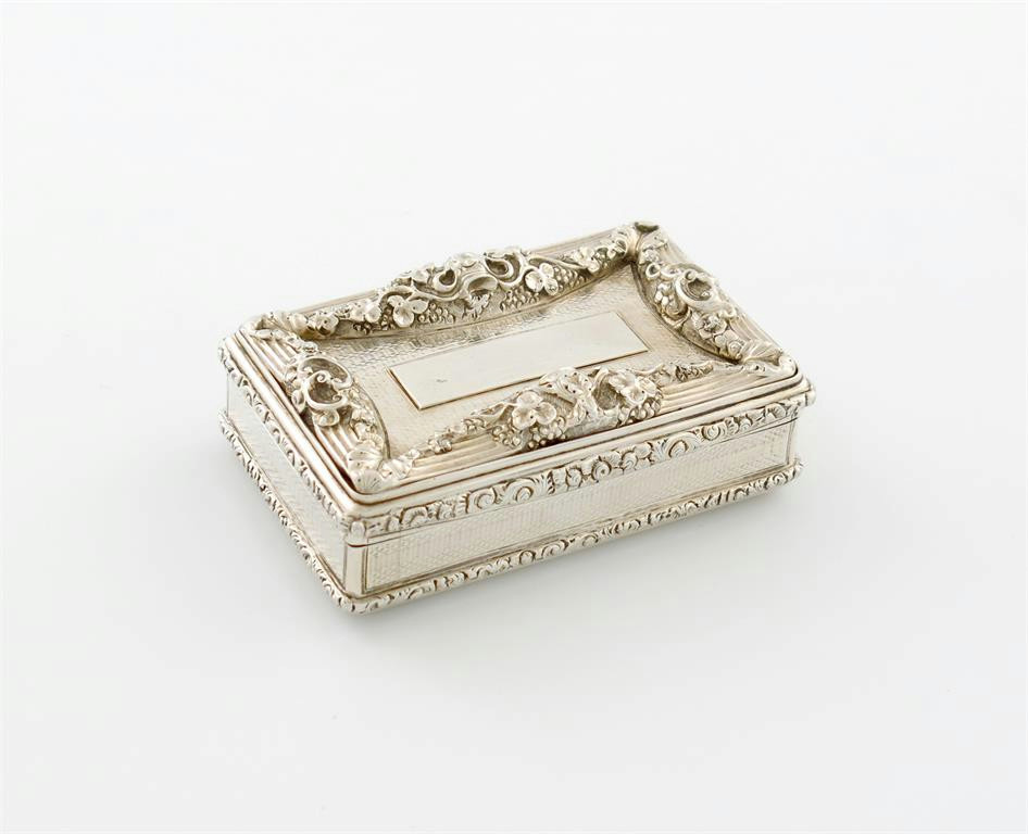 rectangular form, engine-turned decoration, the hinged cover with a heavy reeded and foliate border, with a central vacant cartouche, length 8.8cm, approx. weight 5.5oz.