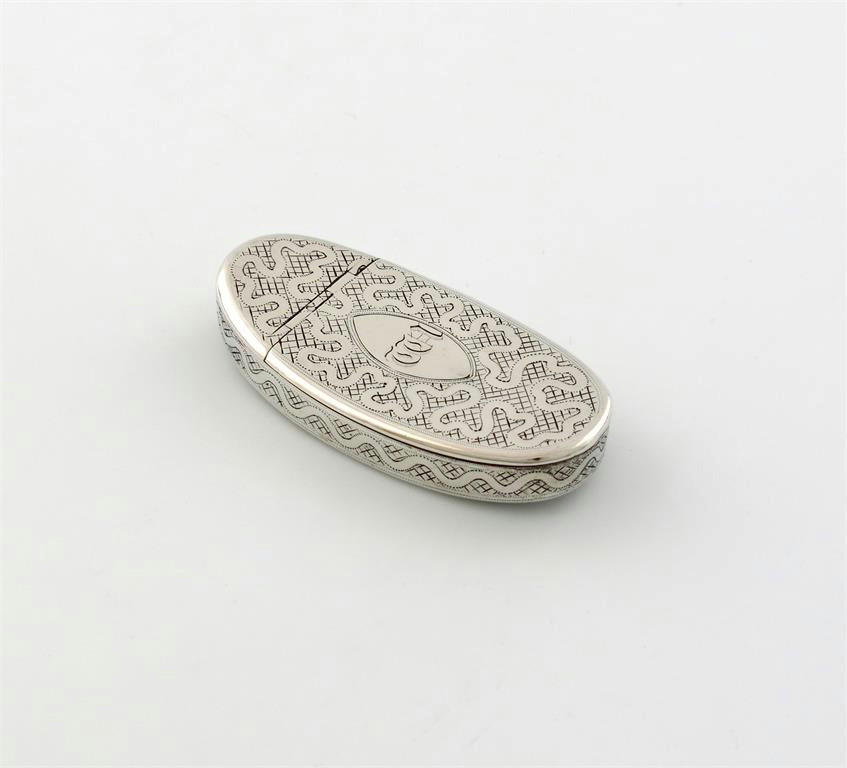 shaped oblong form, engraved wriggle-work decoration, on a matted background, flush-hinged cover, length 8cm, approx. weight 1.5oz.